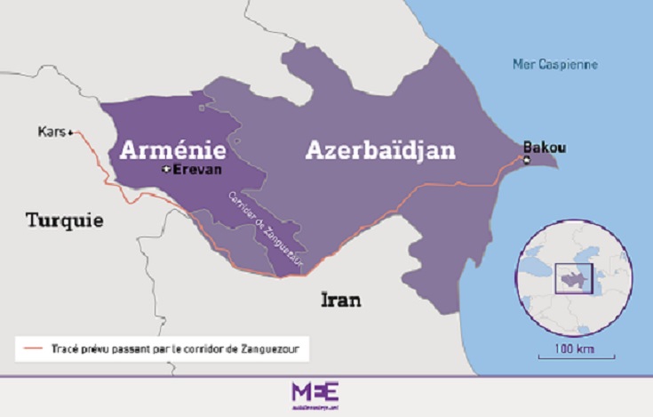 Le corridor de Zanguezour relie l’Azerbaïdjan à sa région autonome du Nakhitchevan via la région arménienne de Syunik et la ville de Meghri, et s’étend sur 40 kilomètres.