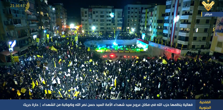 Les amoureux du martyr suprême effectuent la veillée de la nuit du martyre du secrétaire général du Hezbollah sayed Hassan Nasrallah en ce moment, sur le lieu où 80 tonnes de bombes ont été larguées le 27 septembre 2024, par l’ennemi israélien.